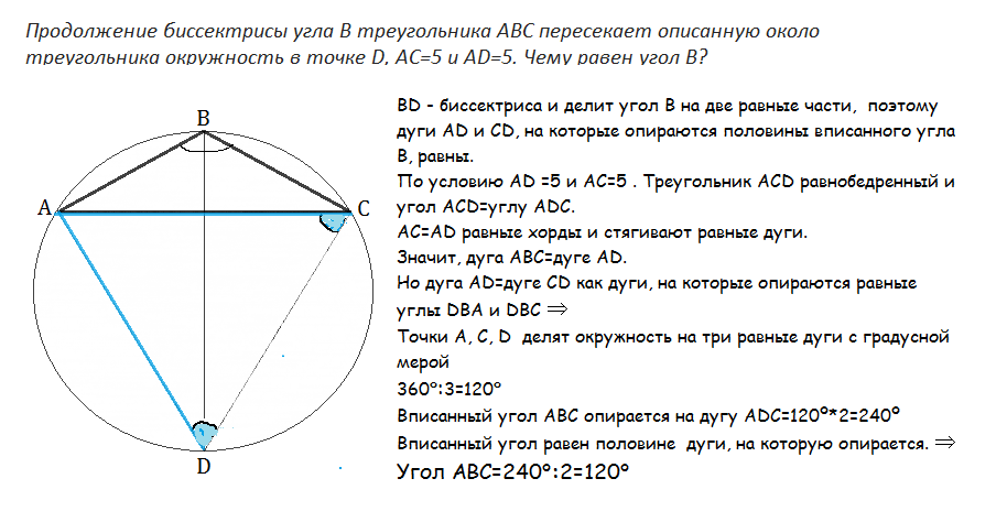 Продолжение биссектрисы угла B треугольника АВС пересекает описанную около треугольника окружность в точке D, АС=5 и АD=5. Чему равен угол В?