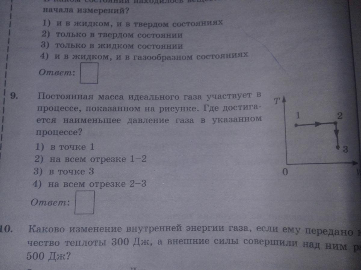 А9 ЕГЭ ПО ФИЗИКЕ .Постоянная масса идеального газа участвует в процессе,показанном на рисунке.Где достигается наименьшее давление газа в указанном процессе? Объясните пожалуйста как решать! Буду очень благодарна!