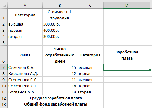 Если категория врача высшая, то заработная плата рассчитывается как произведение числа отработанных дней на соответствующую стоимость одного трудодня (500 руб.) из первой таблицы, и тд.