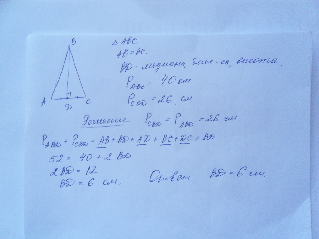 BD - медиана, проведённая к основанию равнобедренного треугольника ABC, периметр которого равен 40см, а периметр треугольника CBD равен 26см. Найдите длину медианы.