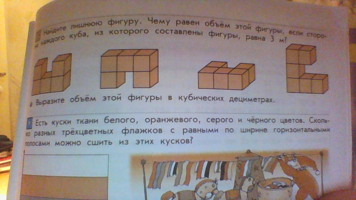 Найди лишнюю фигуру Чему равен объем этой фигуры если сторона каждого Куба из которого составлены фигуры равна 3 метров