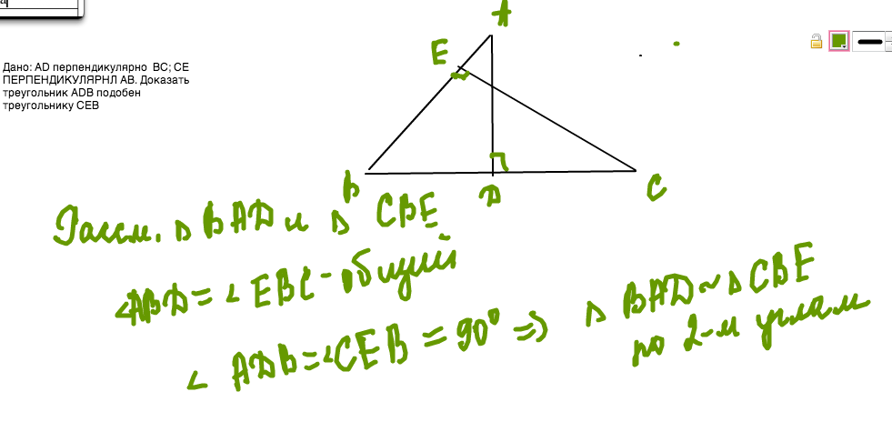 Дано: AD перпендикулярно BC; CE ПЕРПЕНДИКУЛЯРНЛ AB. Доказать треугольник ADB подобен треугольнику CEB