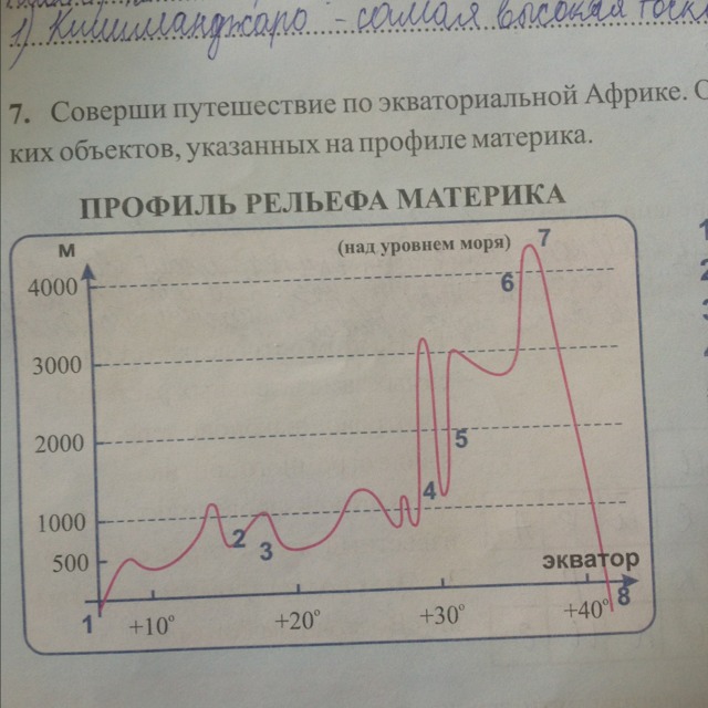Соверши путешествие по экваториальной африке . Определи и подпиши названия геграфических объектов, указанных на профиле материка