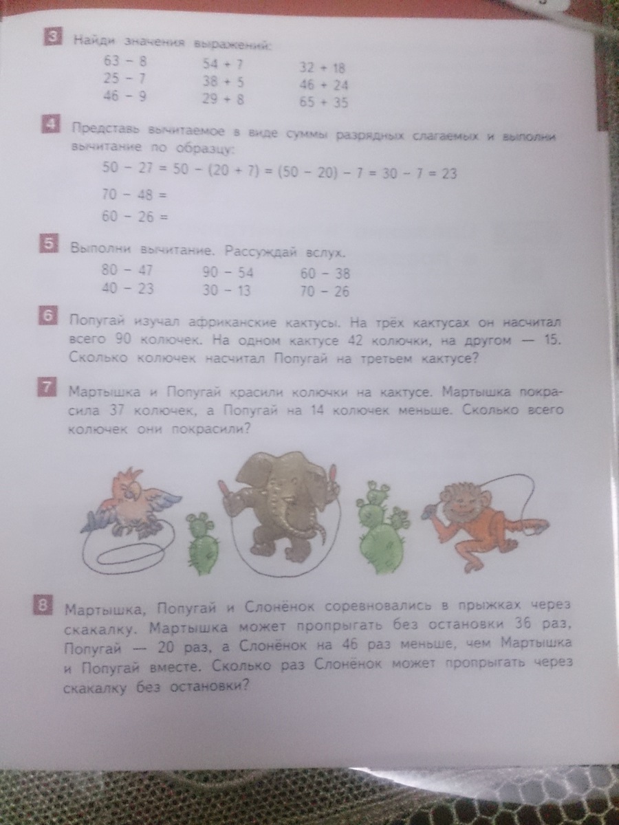 Номер 7. Попугай покрасил 42-15= 27 колючек. Всего они покрасили 37+27= 64 колючки.