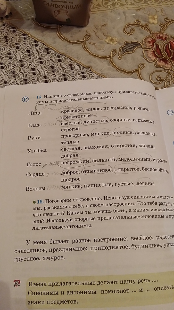 У моей мамы красиво и милое личико . Её глаза светлые и лучистые иногда строгие . Её руки мягкие ,нежные ,но трудолюбивые .Улыбка светлая и добрая.Голос негромкий и мелодичный . Сердце доброе и открытое .