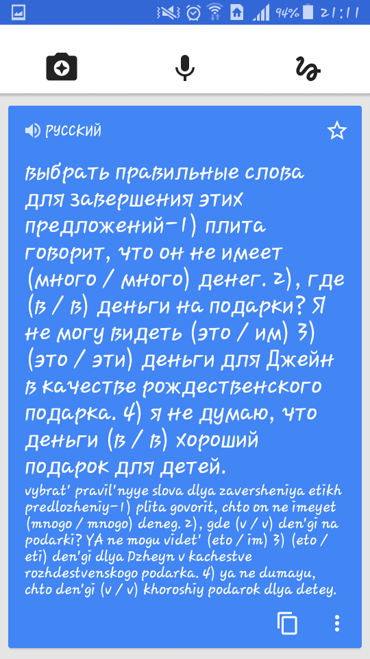 помогите пожалуйста choose the right words to complete these sentences.1)Hob says he doesn t have(many/much)money.2)where (is/are) the money for the gifts? i can t see (it/them).3)(this/these)money is for Jane as a Christmas present.4)i dont think money(is/are)a good present for children.