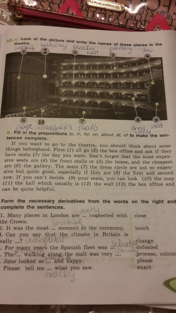 If you want to go to the theatre you should think about some things beforehand. First of all go to the box office and ask if they have seats for the day you want. Don’t forget that the most expensive seats are in the front stalls or in the boxes, and the cheapest are in the gallery. The seats in the dress circle are not so expensive, but quite good, especially if they are in the first and second row. If you can’t decide about your seats you can look at the map of the hall which usually is on the wall of the boxoffice and can be quite helpful.