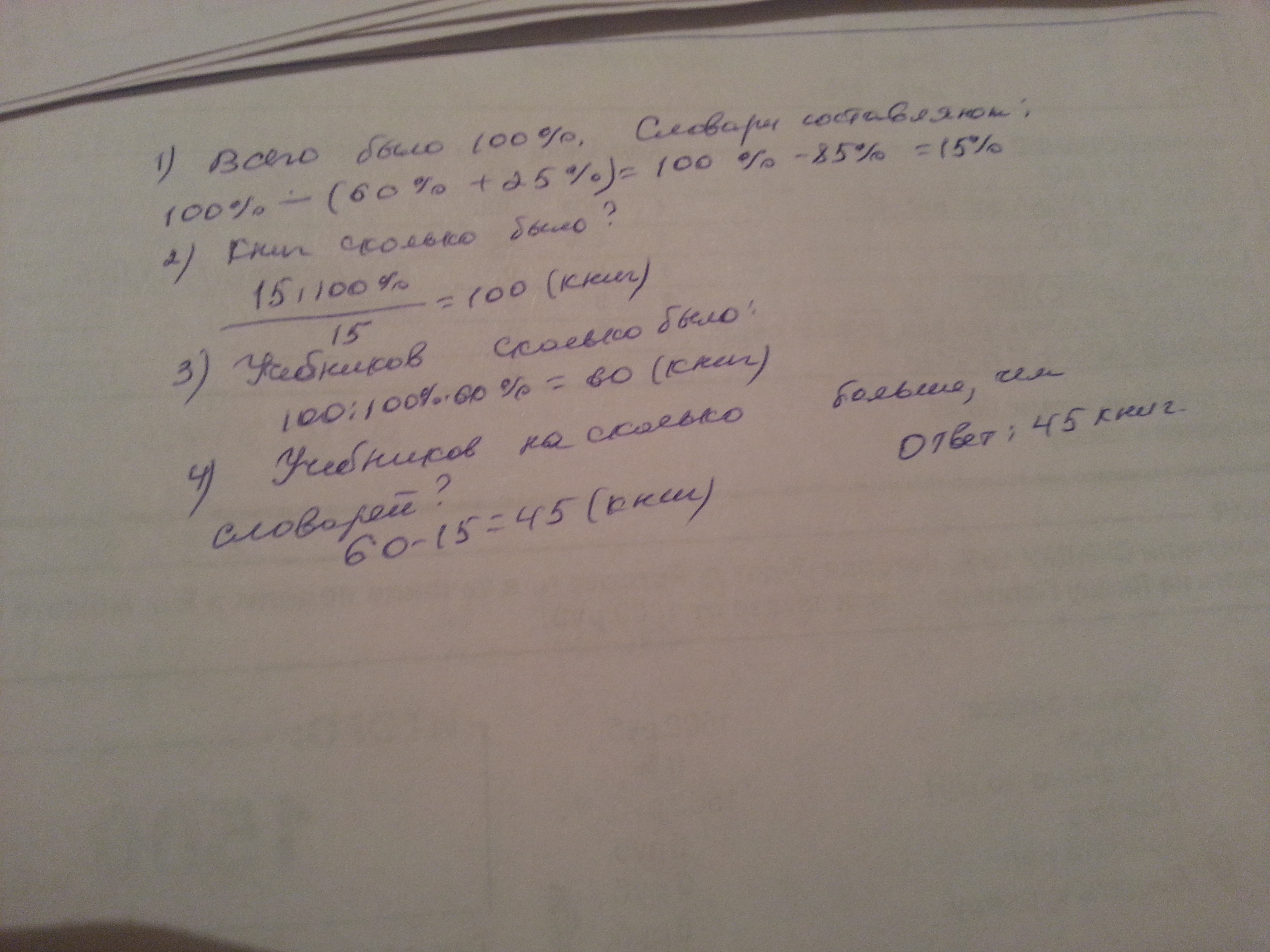 в школьную библиотеку привезли новые книги. учебники составили 60% всех привезенных книг, худ лит-ра 25%, а остальные 15 книг словари. сколько всего книг привезли? на сколько учебников было больше, чем словарей?