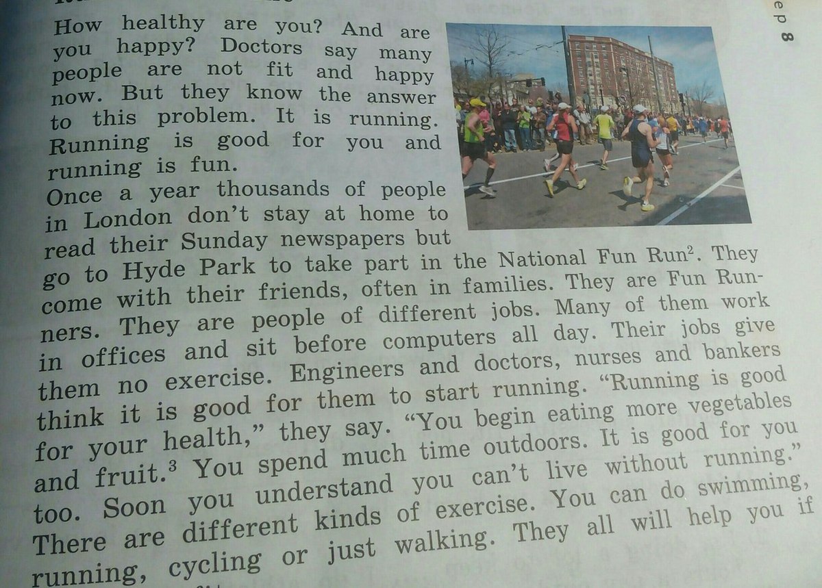 Насколько ты здоров? Насколько ты счастлив? Доктора говорят, что сейчас многие люди не спортивны и несчастны. Но они знают решение этой проблемы. Это бег. Бег хорош для тебя и весел. Раз в год тысячи людей в Лондоне не остаются дома, читая свои субботние газеты, а отправляются в Гайд-Парк для того, чтобы принять участие в Национальном Веселом Забеге. Они приходят со своими друзьями, часто семьями. Они Веселые Бегуны. Они люди с разных работ. Многие из них работают в офисах и сидят за компьютером весь день. Их работа не даёт им разминки. Инженеры и доктора, медсёстры и банкиры считаю, что начать бегать - хорошо для них. " Бег - это хорошо для здоровья", говорят они. "Ты начинаешь есть больше фруктов и овощей. Ты проводишь больше времени на улице. Это также хорошо для тебя. Вскоре ты понимаешь, что не можешь жить без бега". Есть разные виды упражнений. Ты можешь заниматься плаванием, бегом, велосипедным спортом или просто гулять. Это всё поможет тебе, если ты хочешь стать здоровым.