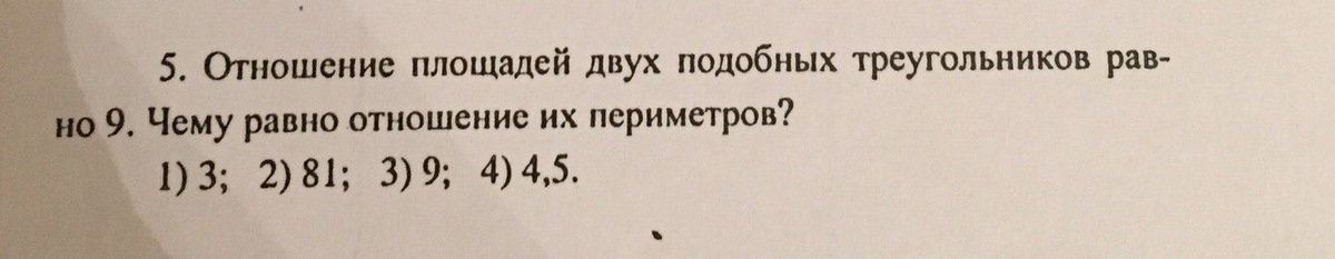 Отношение площадей подобных треугольников равно квадрату коэффициента подобия .Отношение периметров равно коэффициенту подобия ,следовательно √9=3 - таково отношение их периметров ,1)вариант.