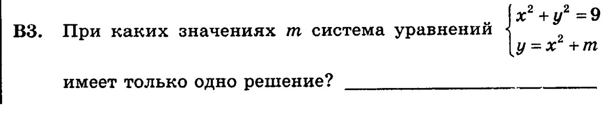 Одно решение система будет иметь только в случае касания параболы и окружности. А это возможно только когда вершина параболы будет в точке с координатами ( 0 ; 3). ОТВЕТ: m = 3.