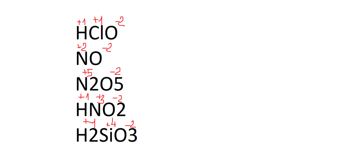 Задание: Рассчитайте степени окисления выделенных элементов в соединениях HCl, HClO, NO, N2O5, HNO2, H2SiO3. Закрепите в своём сознаний тот факт, что молекула электронейтральна, водород имеет заряд +1, а кислород -2.