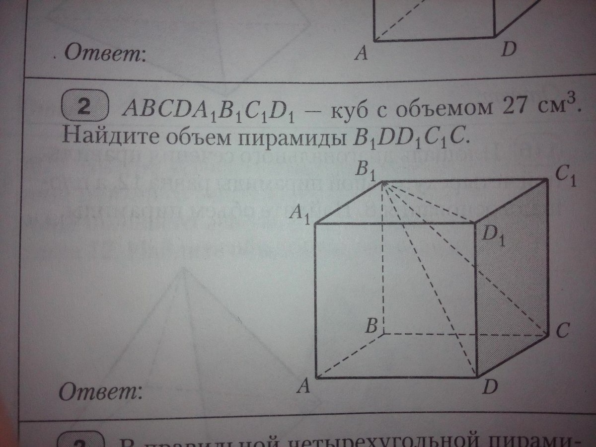 Объем пирамиды равен V=1/3*S*h, где S - площадь основания, h - высота. h=B1C1=3см. S=a^2=9см^2. V=1/3*9*3=9(см^2).