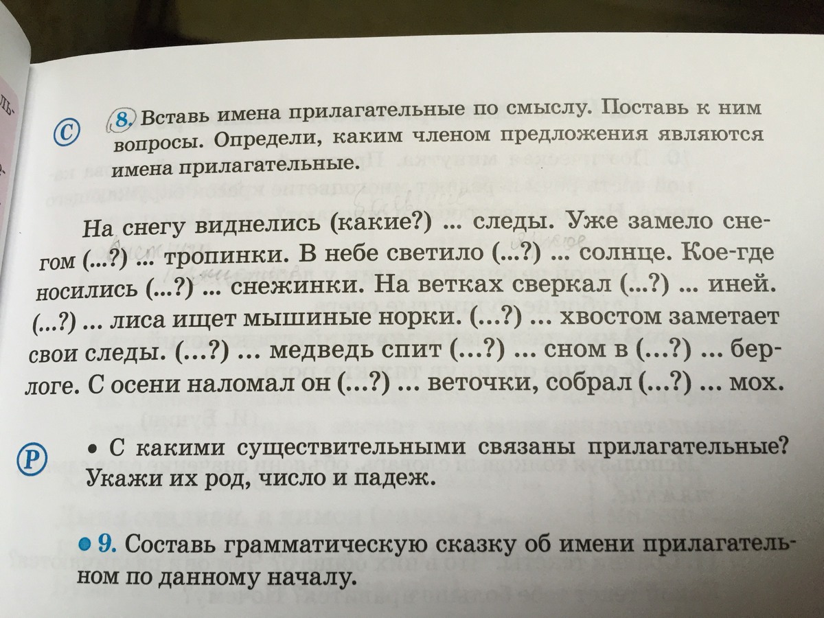 На снегу виднелись белые следы.Уже замело снегом белоснежные тропинки.В небе светило яркое солнце.Кое-где носились маленькие снежинки.На ветках сверкал ... Иней.А лиса ищет мышиные норки.Лиса хвостом замечает свои следы.А медведь спит сладким сном в берлоге.С осени наломал он ... Веточки,собрал ... мох.