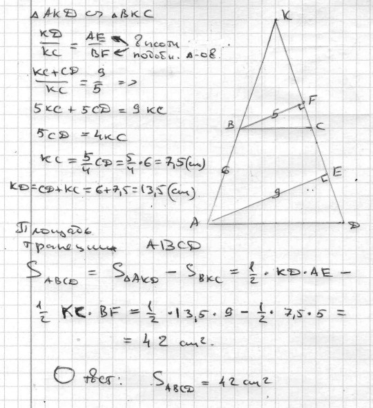Найдите площадь равнобокой трапеции ABCD с боковой стороной CD длины 6, если расстояния от вершин A и B до прямой CD равны 9 и 5 соответственно.