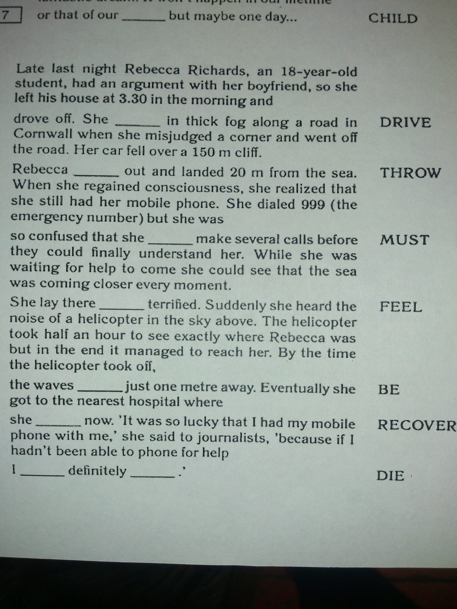 1. Was driving 2. Was thrown 3. Had to 4. Feeling 4. Were 5. Is recovering 6. Would...have died