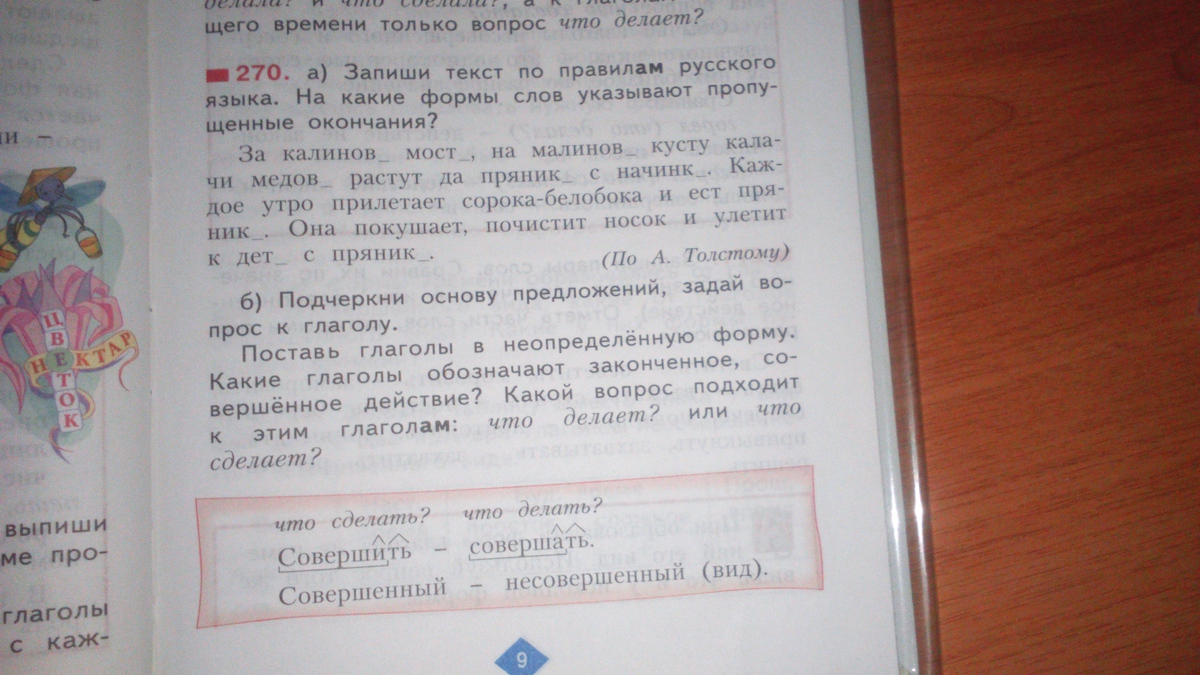 За калиновЫМ мостОМ на малиновОМ кусту калачи медовЫЕ растут да пряникИ с начинкОЙ . Каждое утро прилетает сорока-белобока и ест пряники. Она покушает, почистит носок и улетит к детЯМ с пряникОМ.