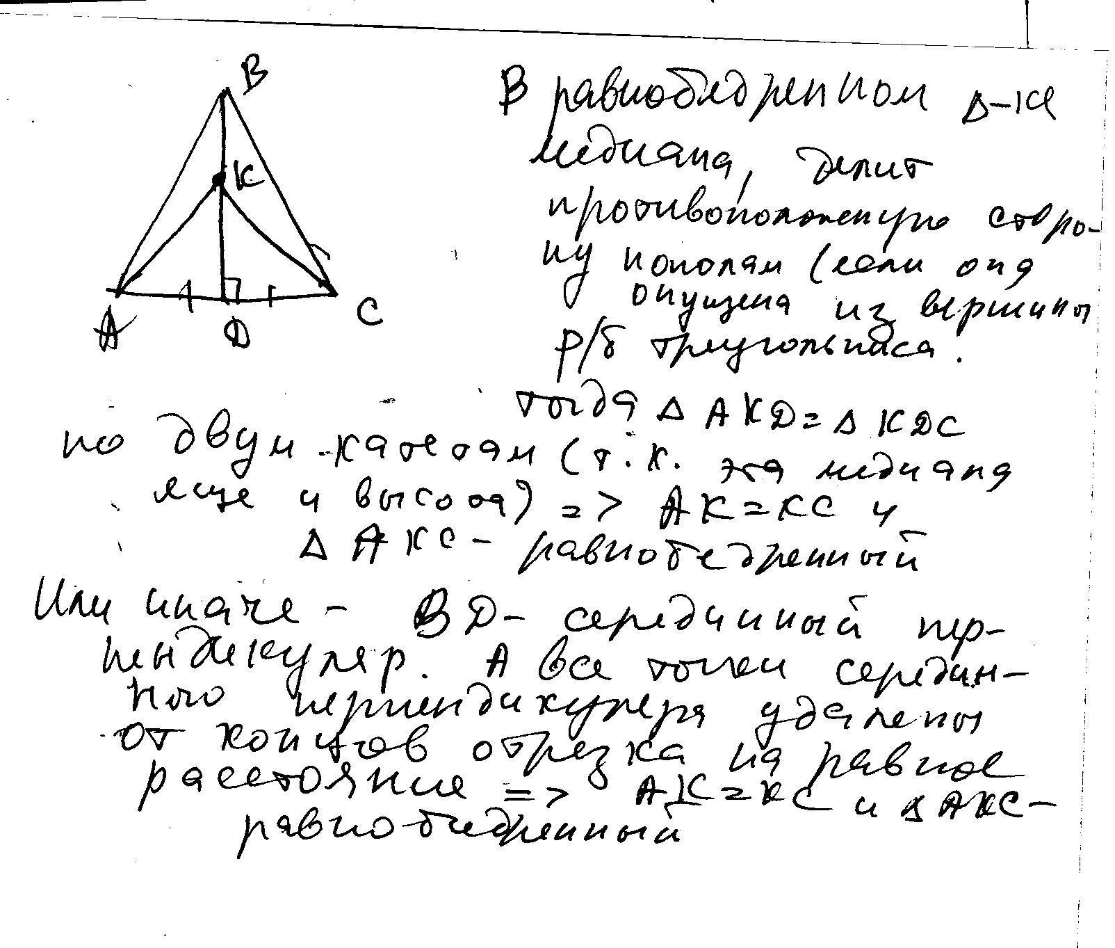 в равнобедренном треугольнике авс с основанием ас на медиане bd отмечена точка к докажите что треугольник акс равнобедренный