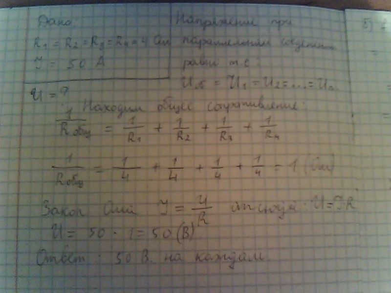 четыре резистора,соединенные переллельно,имеют сопративление по 4Ом каждый.какова сила тока в каждом резисторе,если в общей части цепи сила тока 50А?какова напряжение на каждом резисторе? если можно пожалуйсто с дано!!