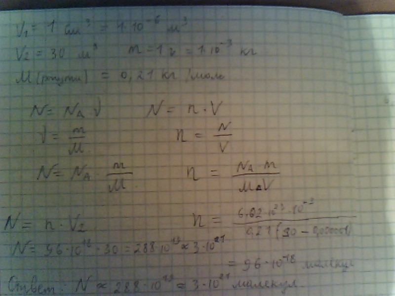 Сколько молекул ртути содержится в 1 см3 воздуха в помещении объемом 30 м3, в котором испарился 1 г ртути? Молярная масса ртути 0,201 кг/моль