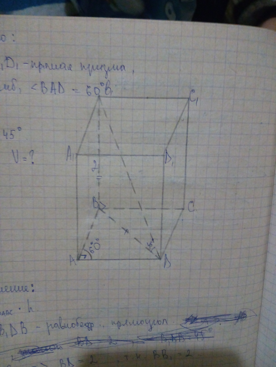 Дано ABCDA1B1C1D1 - прямая Призма, ABCD - ромб, угол BCD равен 60 градусов, bb1 равна 2, угол B1B равен 45 градусов ,найти объем