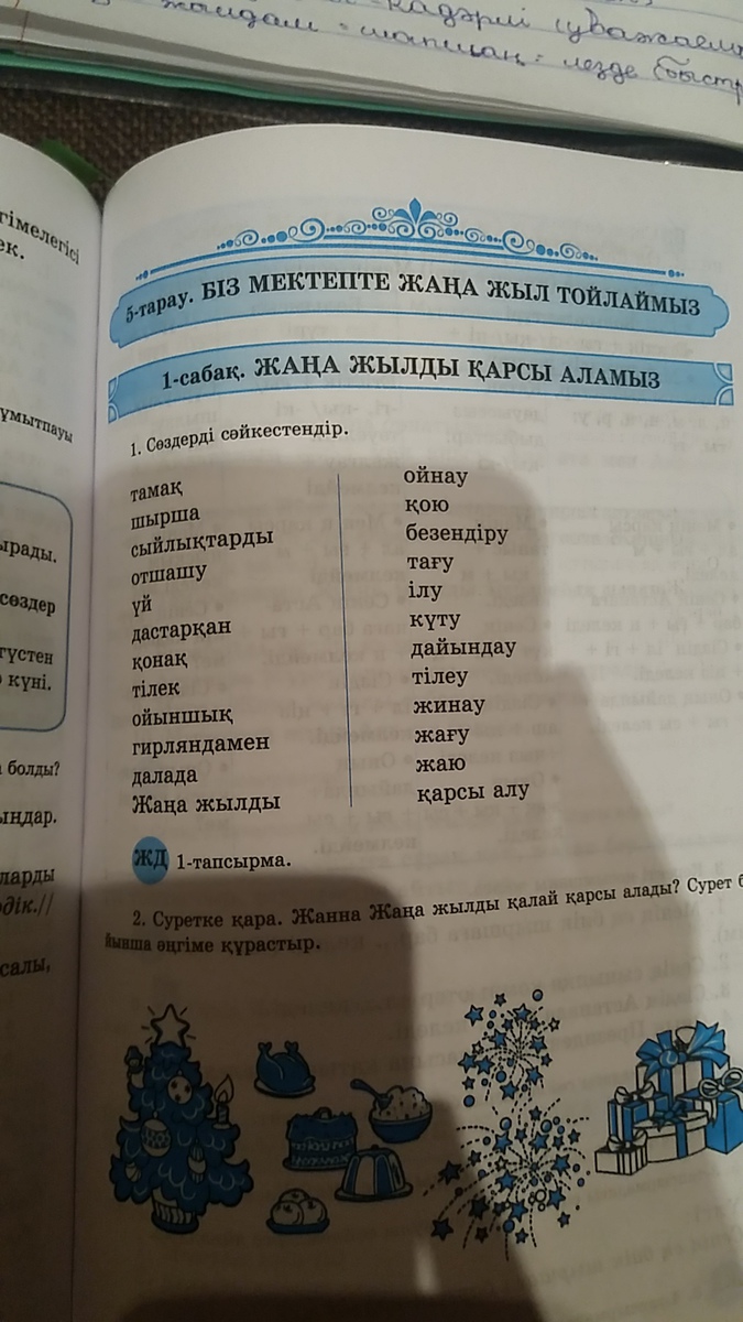 тамак дайындау, шырша безендиру, сыйлыктарды кою, отшашу жагу, уй жинау, дастархан жаю, конак куту, тилек тилеу, ойыншык кою, гирляндамен тагу, далада ойнау, жана жылды карсы алу