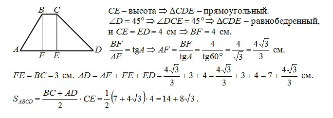В трапеции АВСD угол А=60 градусов, уголD=45 градусов, основание ВС равно 3cм, BF и CE-высоты трапеции, ЕD= 4см. Найдте площадь трапеции.