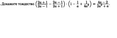( frac{(2a+1)(2a+1)-(2a-1)(2a-1)}{(2a+1)(2a-1)} )* (frac{4 a^{2} -4a+1}{4 a^{2} } )=( (frac{4 a^{2}+4a+1)-(4 a^{2}-4a+ 1)}{(2a+1)(2a-1)} )*  \  frac{(2a-1)^2}{4 a^{2} } = frac{8a}{2a+1} * frac{2a-1}{4 a^{2} } = frac{2(2a-1)}{a(2a+1)} = frac{4a-2}{2 a^{2} +a}