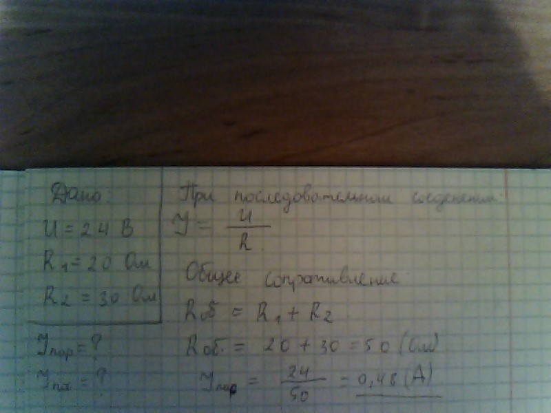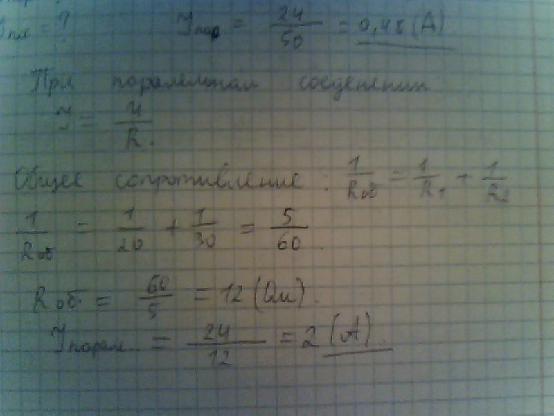 2 резистора сопротивление которых20 и 30 Ом ,напрежение 24 в. Кокова сила тока в этой цепи при последовотельном и паралельном соединениерезисторов