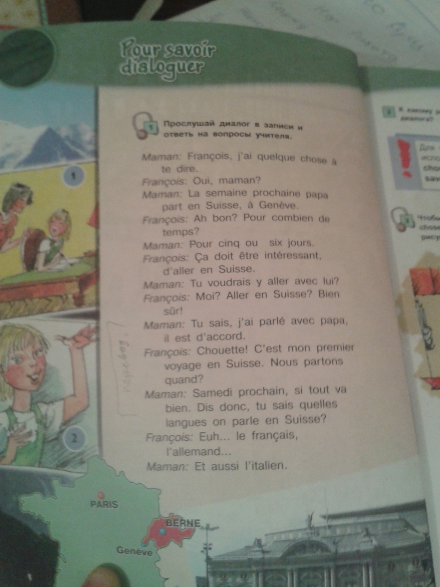 Франсуа Мама, я что-то сказать Франсуа Да, мама? Мама: Папа На следующей неделе из Швейцария, Женева Франсуа: В самом деле? Как долго? Мама За пять-шесть дней. Франсуа это должно быть интересно, чтобы пойти в Швейцарию. Мама: Вы хотите, чтобы пойти с ним? Франсуа меня? Перейти в Швейцарию? Хотя мама: Вы знаете, разговаривал с папой, он соглашается. Франсуа: Отлично! Это моя первая поездка в Швейцарию. Мы оставляем когда? Мама: В следующую субботу, если все идет хорошо. Эй, вы знаете, что языки говорят в Швейцарии? Э-э ... Франсуа французский, немецкий ... Мама: А также итальянский.