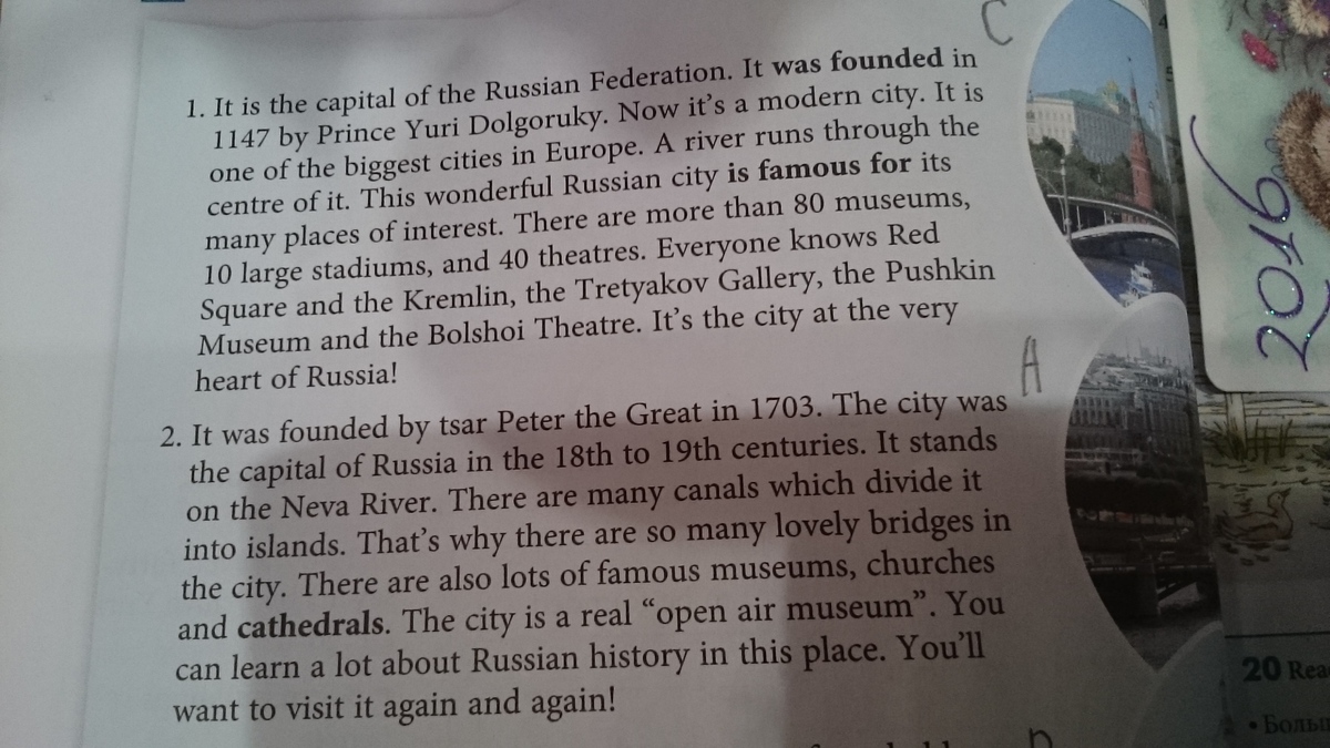 1. Это столица Российской Федерации. Столица была основана в 1147 Юрием Долгоруким. Сейчас это современный город. Это один из самых больших городов Европы. Через его центр проходит река. Этот чудесный русский город известен большим количеством интересных мест. В нем больше 80 музеев, 10 больших стадионов и 40 театров. Все в мире знают Красную площадь и Кремль, Третьяковскую Галерею, Пушкинский музей и Большой Театр. Этот город - сердце России.