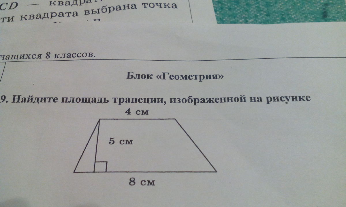 S трапеции= (а+в)/2*h S=(4+8)/2*5=6*5=30