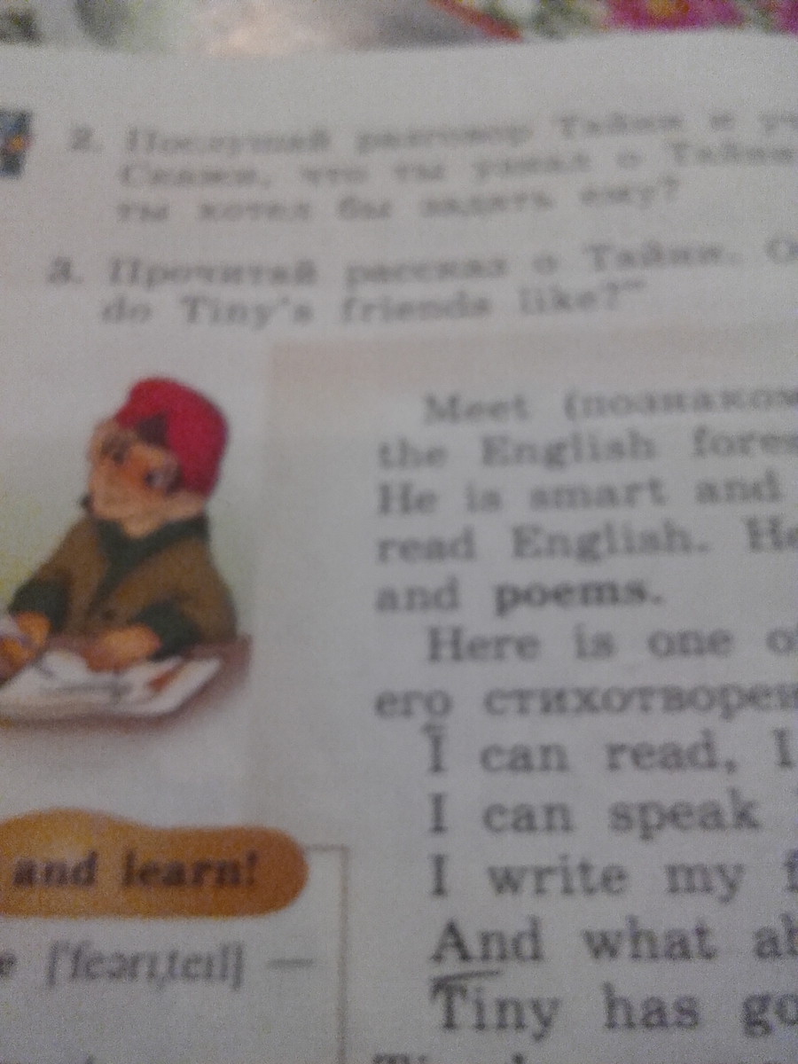 Познакомься с Тайни. Он живет в английском лесу. Он смешной и добрый. Он умный и веселый. Тайни умеет говорить и читать по-английски. Он любит писать сказки и стихи.
