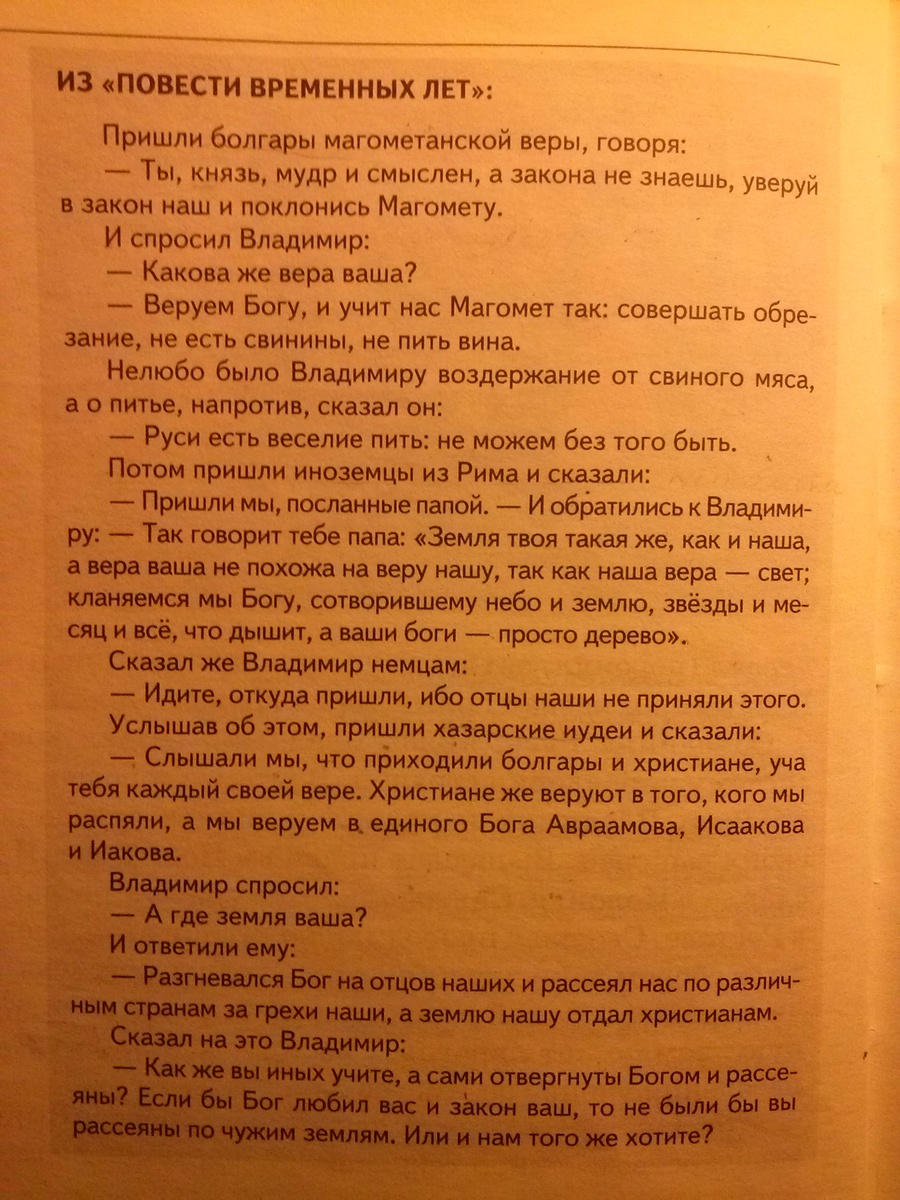 Владимир не хотел отказываться от возможности есть мясо и пить алкоголь, ссылается на неуважение другими религиями язычества(во что отцы верили); Из-за божьей кары были расселены хазарские иудеи - князь не хотел такой же участи. На выбор религии повлияли многие факторы, в том числе и эти, которые и описывает летописец