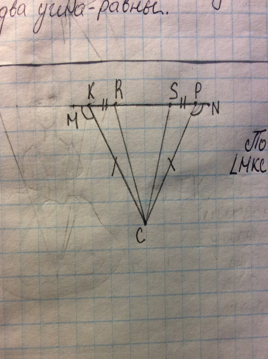 треугольники равны по двум сторонам и углу между ними. у них: 1)RK=PS по условию. 2)MC=PC по условию. 3) уголRKC = углуSPC, т.к. они смежные с углами MKC и NPC, которые равны.