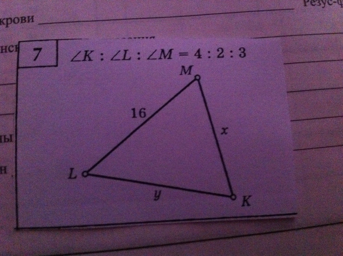 Очень надо ! Пожалуйста помогите полным решением срочно! Дано отношение уголов K : L : M = 4 : 2 : 3 в треугольнике, еще известна сторона LM = 16 . Найти MK - x? и KL - y?