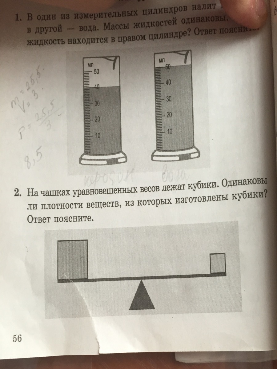 Так весы уравновешены, то масса грузов одинаковы, но объем правого груза меньше левого груза, следовательно его плотность больше. Плотность вещества, из которого сделан правый кубик, больше.