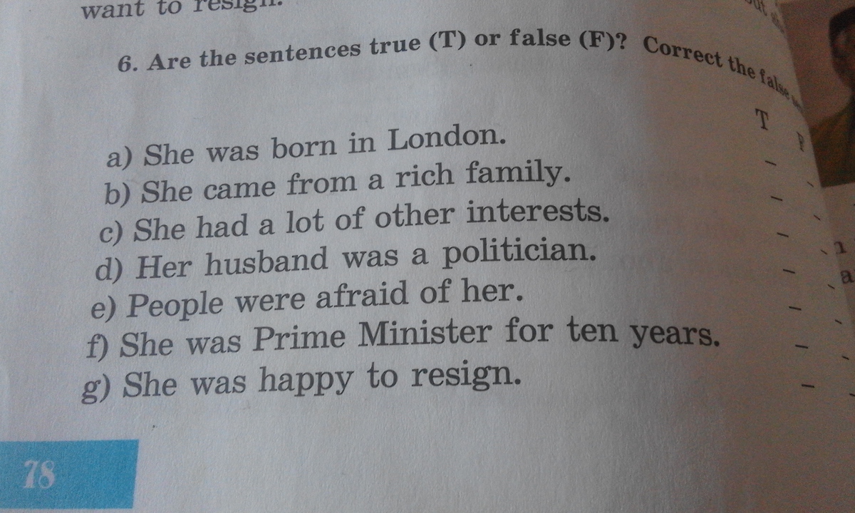 нужно ответить, правдивы высказывания или нет. но. перед этим вы должны были поставить текст про эту девушку. без знания текста ответить невозможно. могу только перевести вопросы