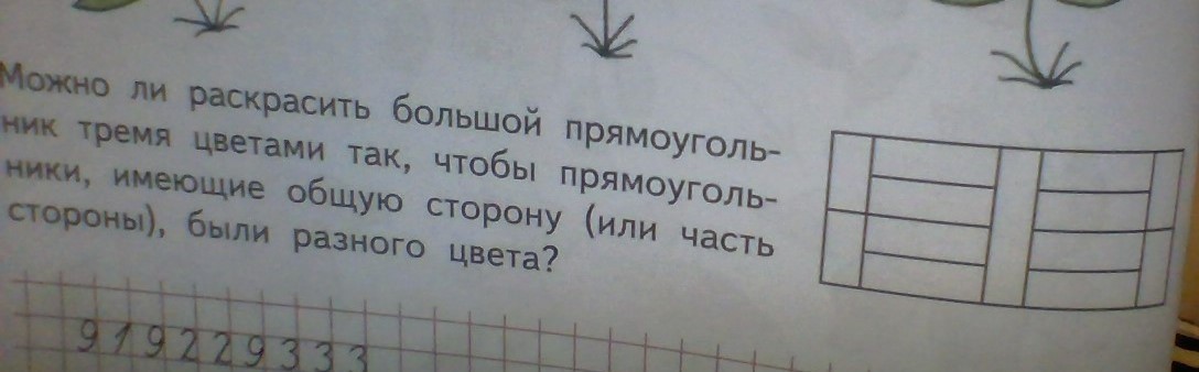 Помогите!!!!Можно ли раскрасить большой прямоугольник 3 цветами так,чтобы прямоугольники,имеющие общую сторону(или часть стороны),были разного цвета?