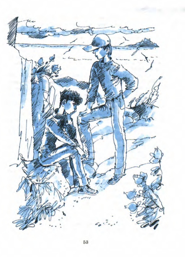 the boy is telling his friend an interesting story about seagulls,which are flying above the waves.the girl is bending her head and listening to him.