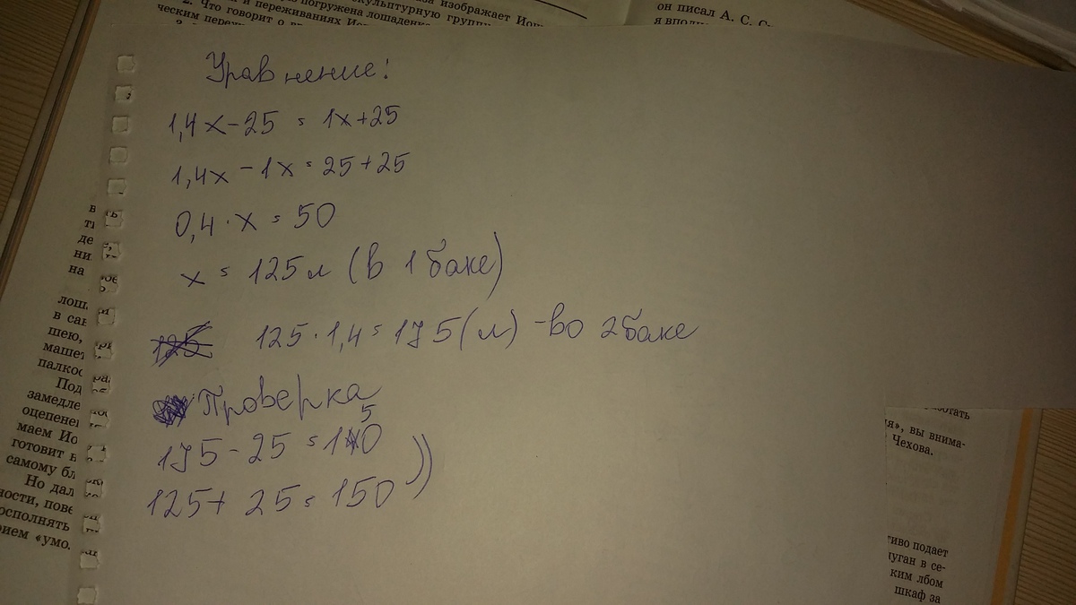 В первом баке бензина в 1,4 раза меньше,чем в другом. Если перелить из второна бака в первый 25 литров,то бензина в них окажется поровну. Сколько всего бензина в обоих баках?