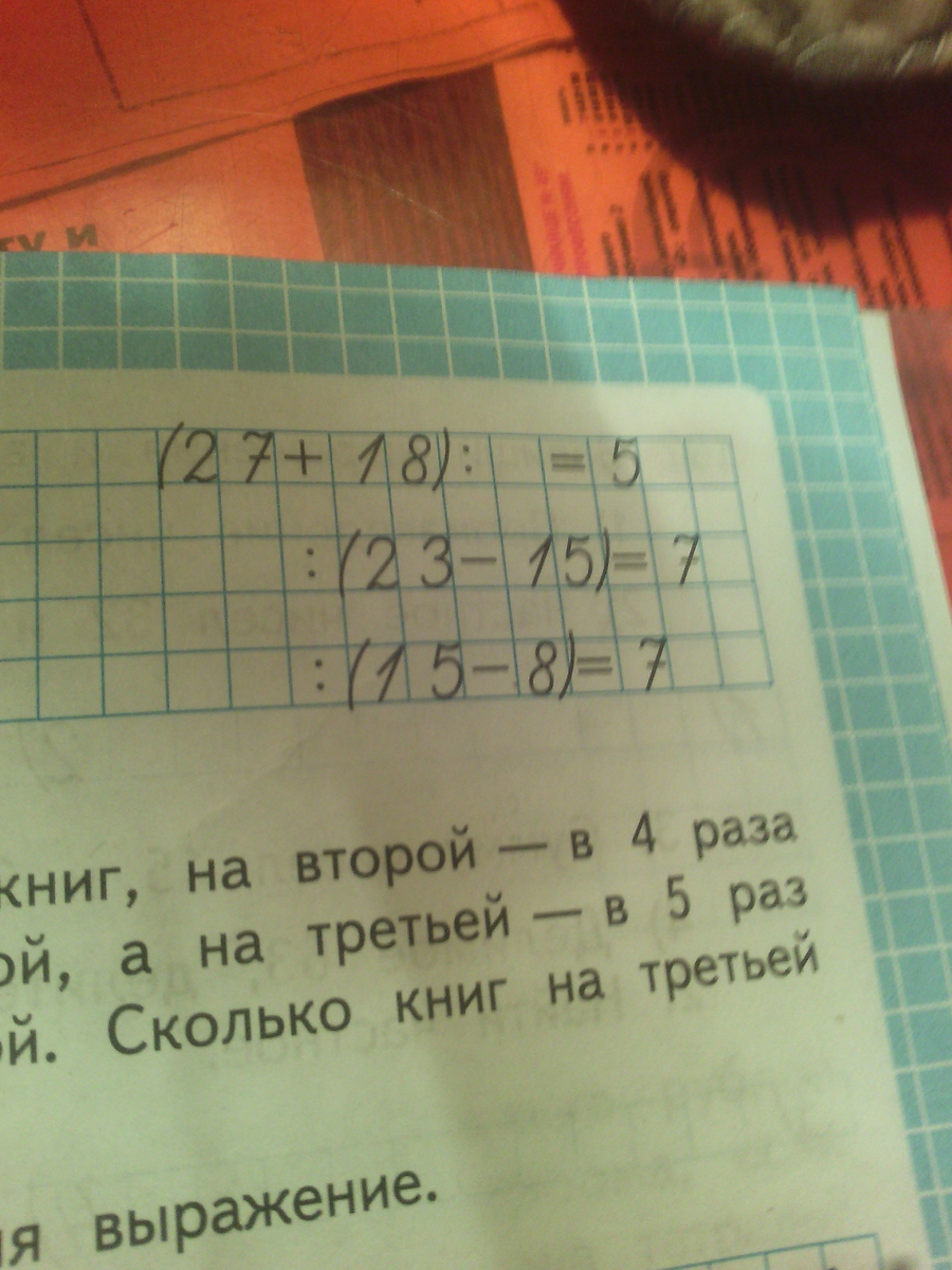 (27+18)÷9=5 это ответ если 27+18=45÷5 то равно 9