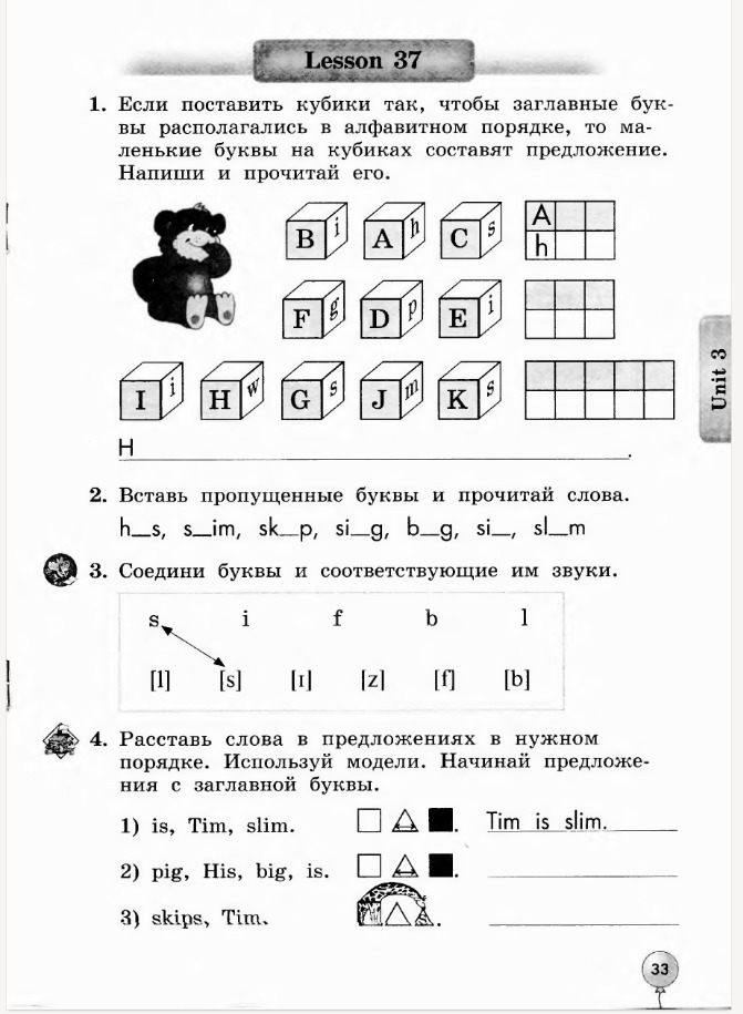 Если поставить кубики так, чтобы заглавные буквы располагались в алфавитном порядке, то маленькие буквы на кубиках составят предложение. Напиши и прочитай его.
