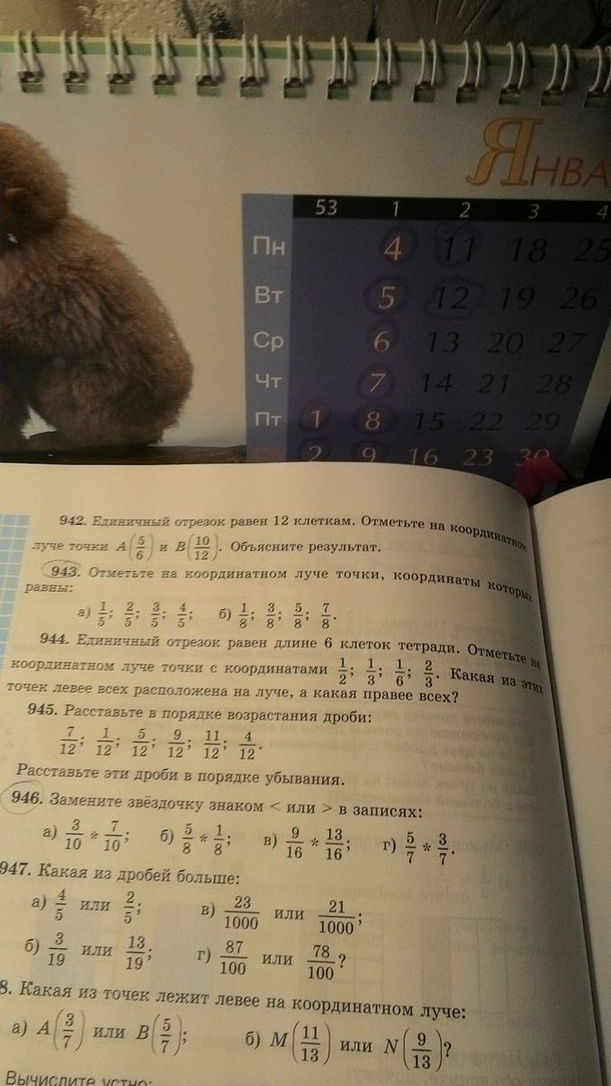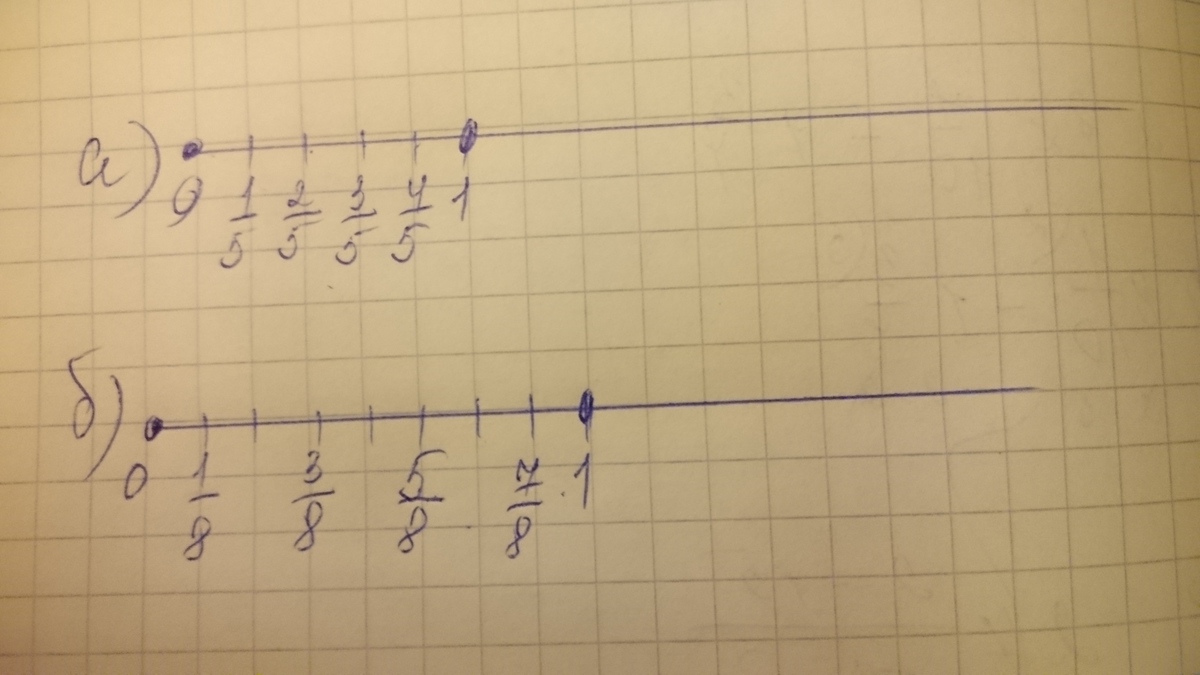 Все довольно просто. Например, 1/5 - это часть от пяти, то есть на луче нужно отобразить единичный отрезок, равный пяти делениям. В общем, подробнее на фото