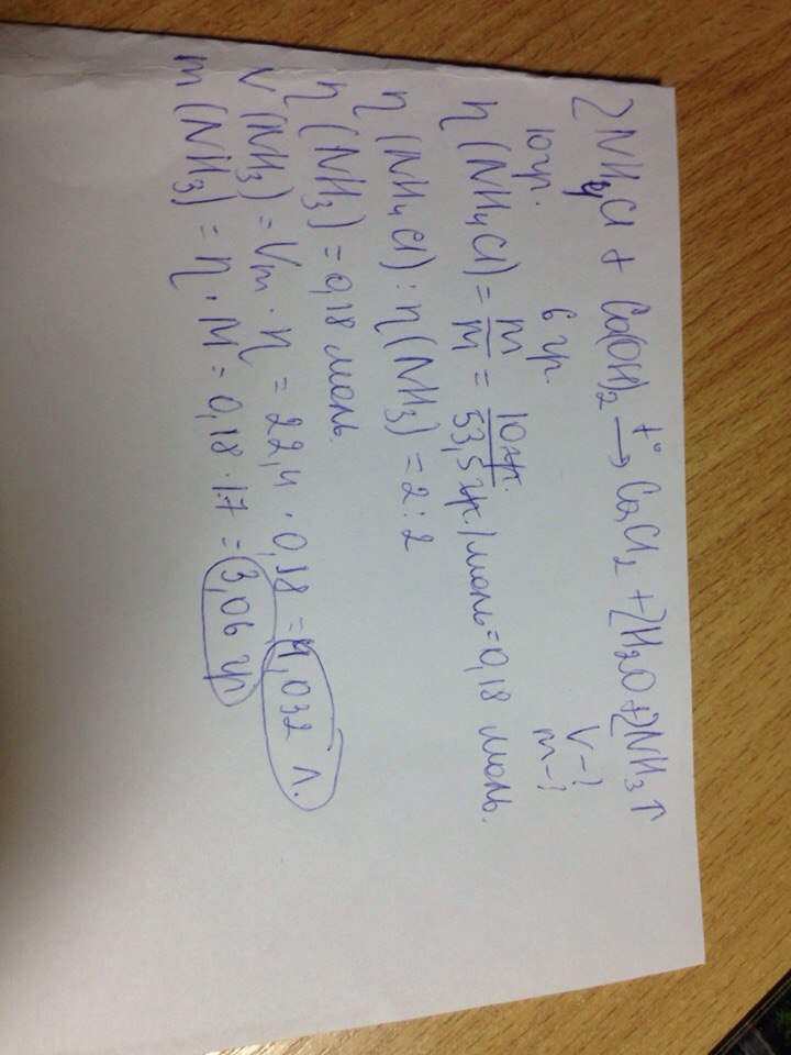 Смешали 10.7 г хлорида аммония с 6 г гидроксида кальция и смесь нагрели.Какой газ и в каком количестве по массе и объему выделится