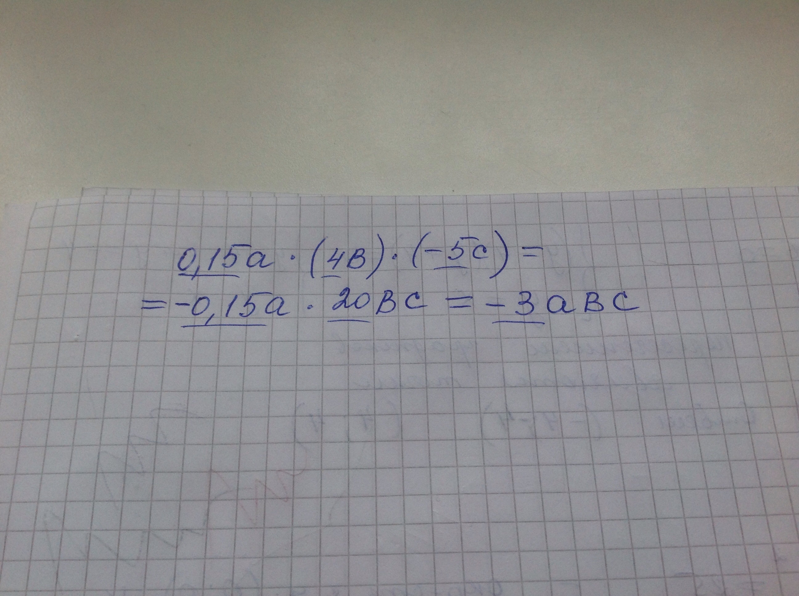 преобразуйте выражение в тождественно равное, используя переместительное и сочетательное свойства умножения. Подчеркните коэффициент :0,15a*(4в)*(-5c) ,пожалуйста мне срочно