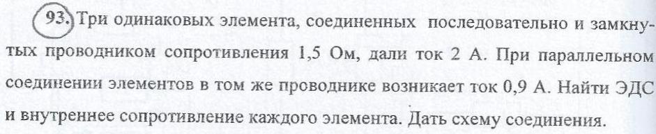 I1=3E/(3Rвн+r) I2=E/((Rвн/3)+r) 6Rвн+2r=3E 0.3Rвн+0.9r=E. Умножив второе на 3 и приравняв левые части, получим 5,2Rвн=0,7r. Отсюда Rвн=0,206 Ом, Е=1,41 В.