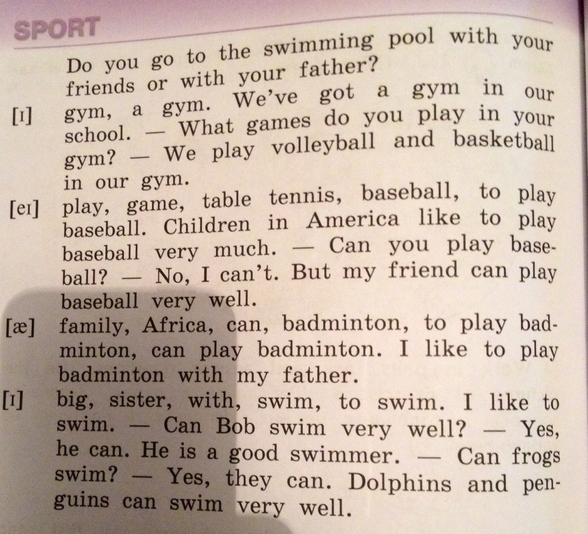 Ты ходишь в бассейн со своими друзьями или отцом? Спортзал,спортзал. У нас в школе есть спортзал.- Какие игры вы играете в спортзале?-Мы играем в волейбол и баскетбол в нашем спортзале. Играй, игра, настольный теннис, бейсбол ,играть,бейсбол.Дети в Америке очень любят играть в бейсбол.Ты умеешь играть в бейсбол? Нет я не умею но мои друзья умеют хорошо играть.Семья, Африка, может, бадминтон, чтобы играть в бадминтон .может играть в бадминтон.Я люблю играть бадминтон.Большой, сестра , спать, плавать, чтобы плавать .Я люблю плавать .Может Боб хорошо плавать?-Да он может.Он хороший пловец.-Могут лягушки плавать?-Да она может .Дельфины и пингвины могут хорошо плавать.