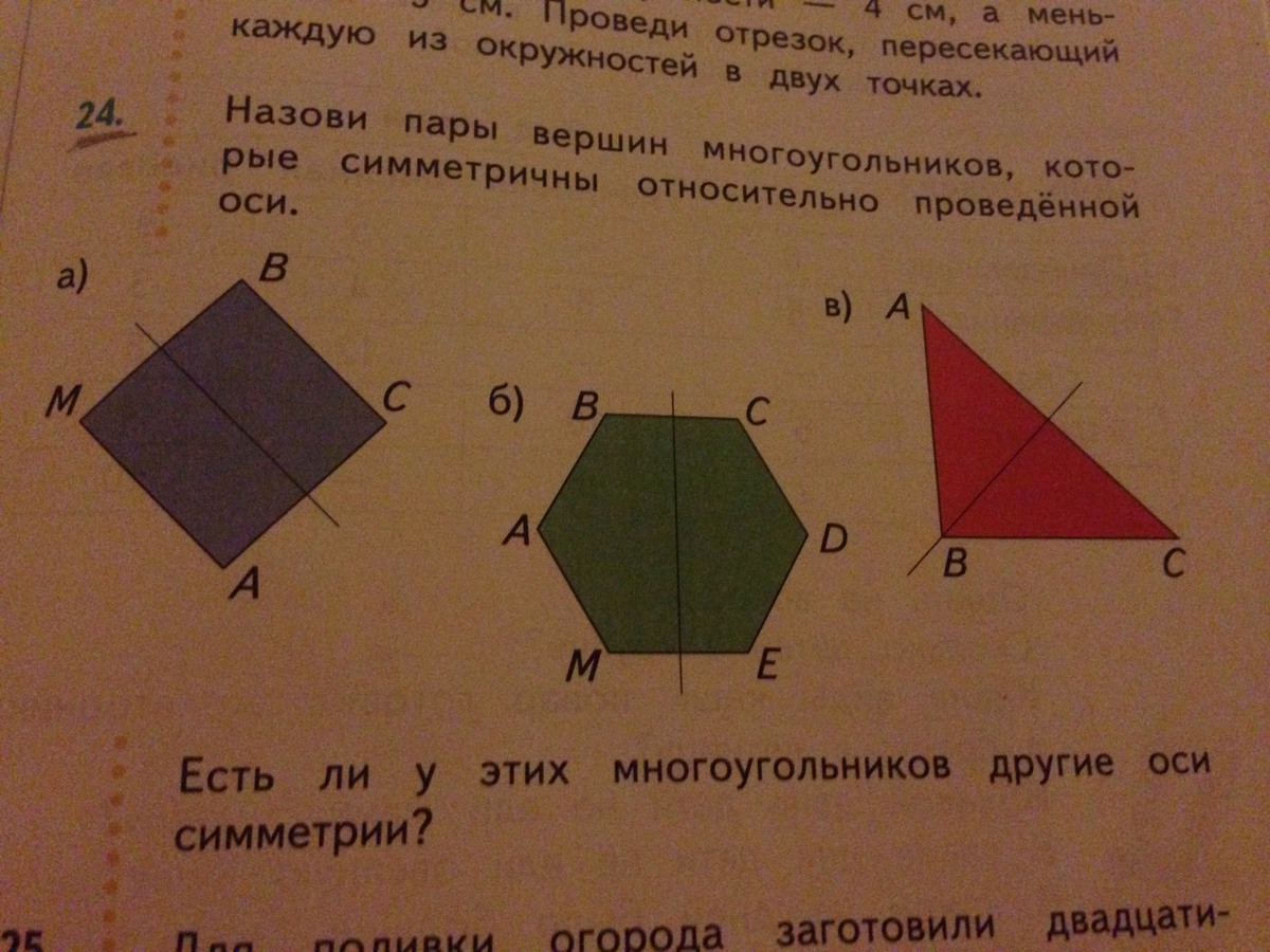 Назовите пары вершин многоугольников, которые симметричны относительно проведённой оси.