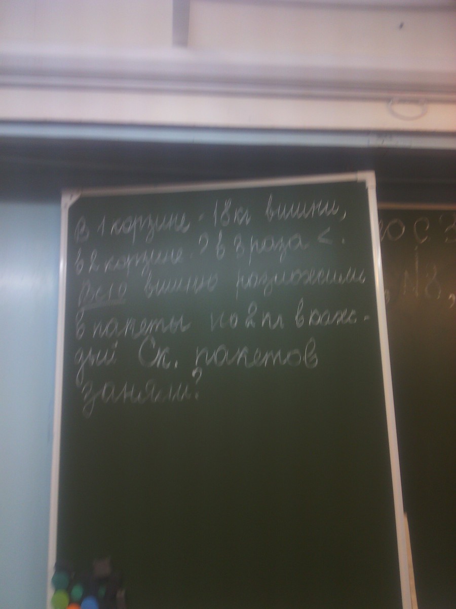 В 1 корзине 18кг вишни в 2 корзине в 3 раза меньше всего 10 Вишни разлажили в пакеты по 2 кг в каждый сколько пакетов заняли
